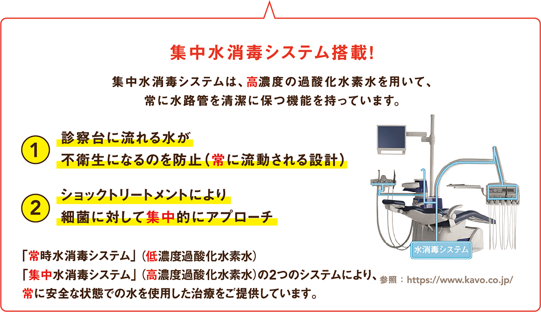 除菌フィルタを採用した「エアー除菌ユニット」で、診療台には常に浄化されたエアーが供給されています。